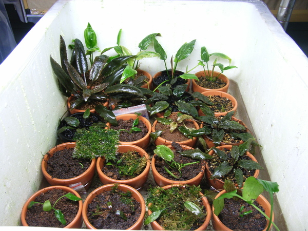 為了讓這些椒客的存活率提高,我這次的介質大多採用黑土(聽說叫蝦天黑土,袋子上面有一隻藍綠色的蝦子)。這種黑土種水草的效果極佳,維持水質為弱酸軟水的能力穩定且長效。因此,只要是野生植株,剛到新環境時,我應該都會採用這種黑土,等穩定後再移植。現在我為了要在最小的地方種植最多品種,已不再採用盆植方式,而以塑膠格子來種椒草。所以照相的角度很糟(其實一切都是我照相技術不好的藉口啦,汗)。要交的作業如下: